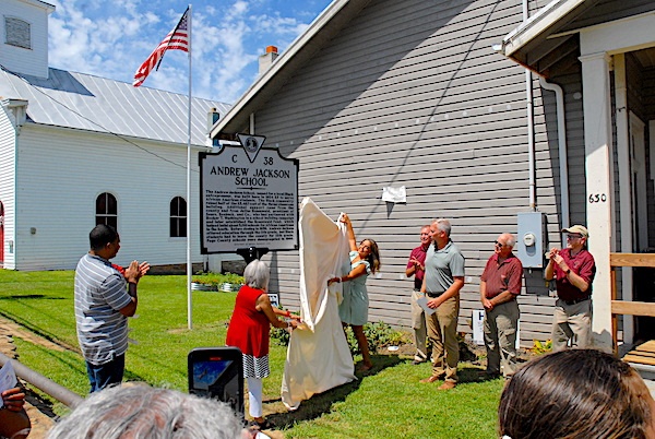 A historical marker at the former Andrew Jackson School is unveiled on Aug. 13, 2022.
