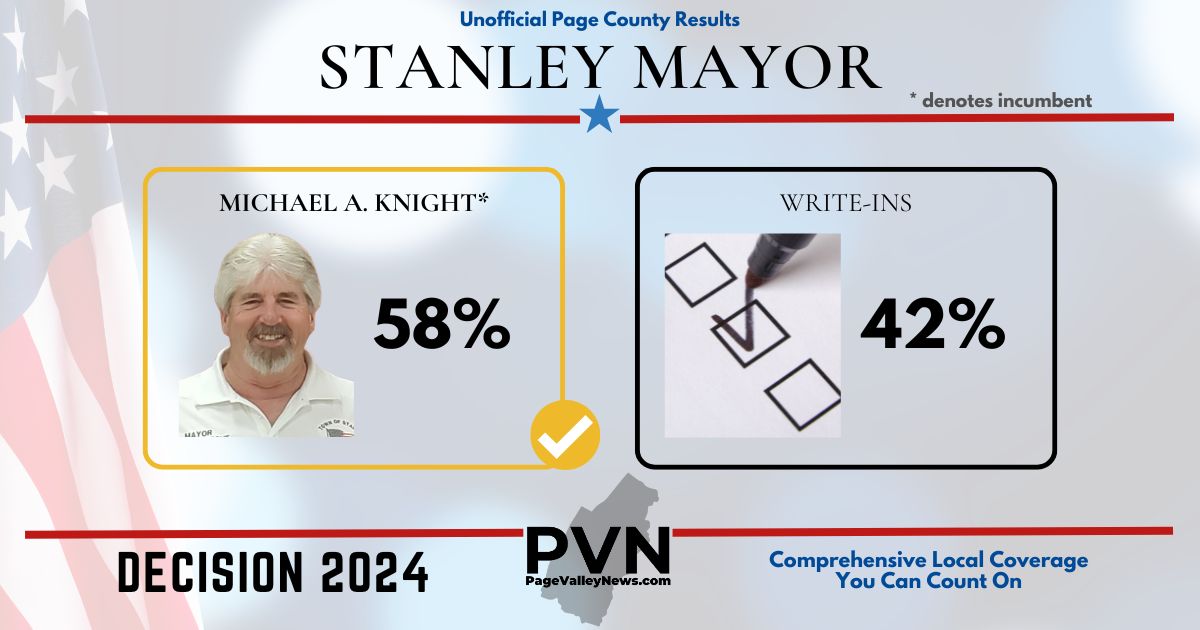 STANLEY, Nov. 5 — Mayor Michael Knight won a third, four-year term as Mayor of Stanley on Tuesday after fending off a late write-in campaign by Councilman Doug Purdham that came up about 84 votes short. Knight received 58.3 percent of the vote, with 431 ballots. There were 308 write-in ballots cast, presumably the vast majority cast for Purdham, who ran a public write-in campaign for the office of mayor.