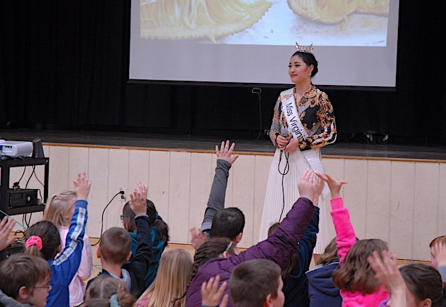 Dot Kelly of Hampton, also known as Miss Virginia when she dons her tiara, spoke to a group of students at Stanley Elementary on Wednesday morning about healthy living habits.
