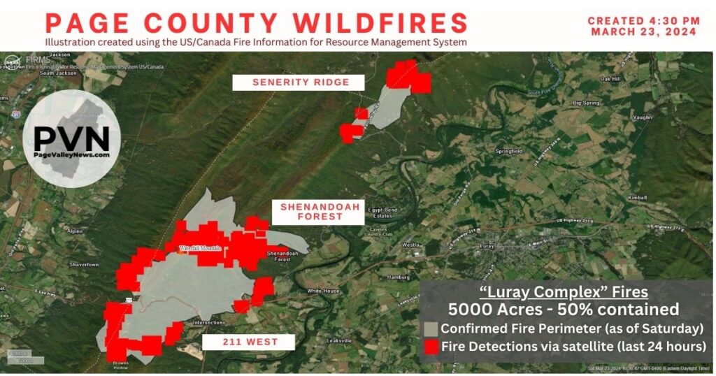 LURAY, March 23 — While the Rocky Ridge wildfire in Shenandoah National Park has spread to 1,000 acres and is 10 percent contained, the Route 211 West fire has seen smaller fires merge as it has now scorched more 5,000 acres and is 50 percent contained, according to the Virginia Department of Forestry.